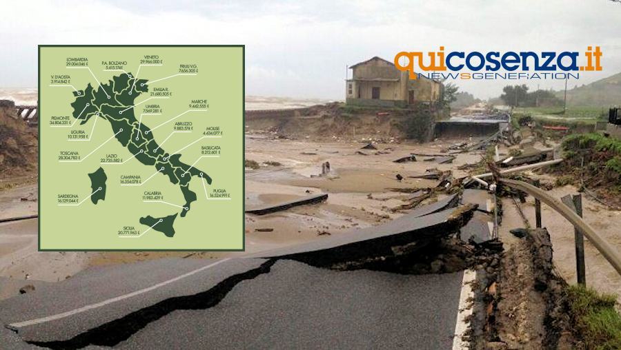 Alla Calabria sono stati destinati fondi per 11,9 milioni di euro. Nel Piano Nazionale per la mitigazione del rischio idrogeologico con il ripristino e la tutela delle risorse ambientali sono 6 gli interventi finanziati nella nostra regione. Oltre 1 milione di euro per la riduzione del rischio idrogeologico in località Maione ad Altilia Grimaldi nel cosentino. Ben 8 milioni di euro per gli interventi di completamento, messa in sicurezza e ripristino della tangenziale Est di Vibo Valentia, 800.000 euro sono destinati al centro abitato di Martirano Lombardo nel catanzarese. Sono invece 940.000 euro i fondi per il completamento e la regimentazione idraulica del torrente San Giacomo a Melissa nel crotonese. Sempre nel crotonese sono 1,2 i milioni di euro destinati alla manutenzione e ripristino della fascia costiera. Infine 797mila euro per i lavori di messa in sicurezza del versante ovest del centro abitato di Soveria Simeri.