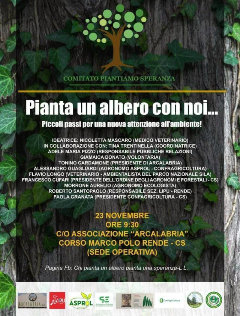 Sabato mattina si potrà compiere questo gesto insieme grazie all’associazione “Arcalabria“, presso la sede in corso Marco Polo a Rende: piantare un albero, per piantare una speranza. L’iniziativa è stata ideata dalla dottoressa Nicoletta Mascaro, medico veterinario in collaborazione con la coordinatrice Tina Trentinella e la collaborazione del gruppo Facebook MaCs, per il quale sarà presente Adele Maria Pizzo. L’evento sarà ospitato da Arcalabria ed il presidente, Tonino Cardamone, ospite negli studi di RLB ha illustrato i dettagli dell’evento