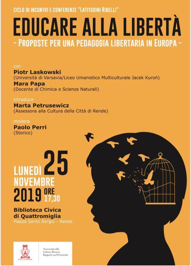 “Latitudini ribelli” è il ciclo di incontri promosso dall’assessorato alla cultura del comune di Rende che parte oggi alle 17,30 con “Educare alla libertà. Proposte per una pedagogia libertaria in Europa”.