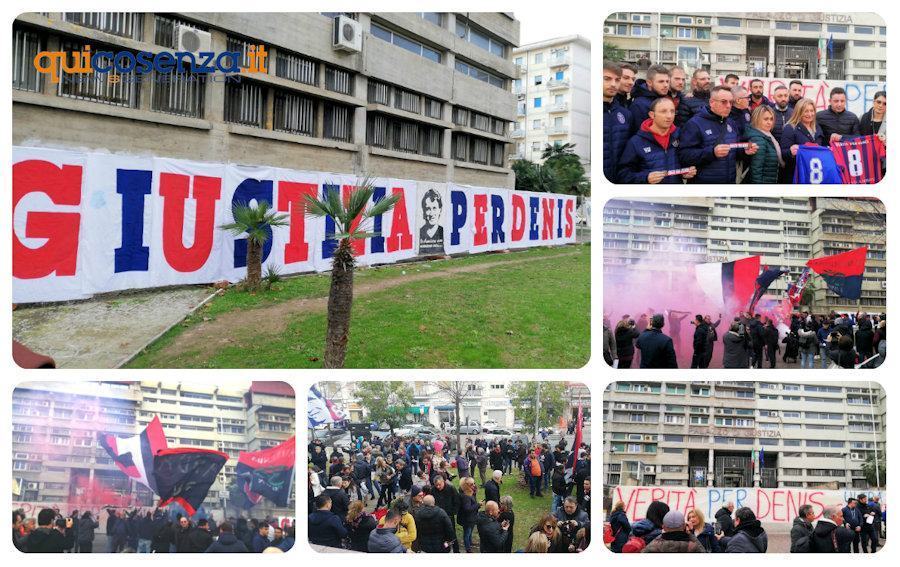 COSENZA – Semplici cittadini, tifosi del Cosenza, associazioni e anche rappresentanti delle istituzioni (su tutti il sindaco di Castrovillari Domenico Lo Polito) si sono ritrovati questo pomeriggio davanti l’ingresso del Tribunale della città nella manifestazione organizzata dall’Associazione “Verità per Denis” nella quale era presente una commossa ma combattiva Donata, la sorella di Denis che da una vita si batte per chiedere giustizia ma soprattutto verità sulla morte del fratello Donato a 30 anni esatti da quel maledetto 18 novembre 1989. Donata ha ricevuto l’abbraccio e il calore dei tifosi del Cosenza che hanno urlato il nome di Bergamini e chiesto a gran voce che l’evoluzione sulla vicenda giudiziaria, condotta in questi anni dal procuratore di Castrovillari Eugenio Facciola, che ha riaperto le indagini e che sembrava ad un passo dalla svolta, vada avanti e che vi siano garanzie sulla corretta gestione delle prossime fasi giudiziarie. La preoccupazione di Donata, della famiglia ma anche di tutti quelli che da anni si battono per avere giustizia, è che con la paventata richiesta di trasferimento del Procuratore di Castrovillari, l’inchiesta finisca per arenarsi. Facciolla è accusato infatti di corruzione e falso. In particolare gli viene contestato l’uso illecito di una scheda telefonica e falso su presunte irregolarità nell’affidamento alla Stm, società che si occupa di intercettazioni, del noleggio di apparecchiature.