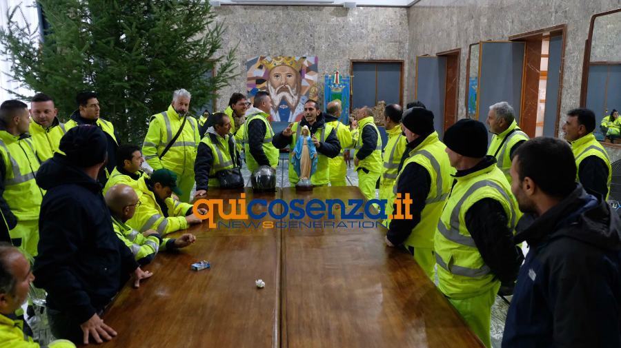 COSENZA – Da giorni la città è invasa dai rifiuti perchè l’impianto è saturo e i lavoratori dell’azienda Ecologia Oggi stanno garantendo solo i servizi essenziali come la raccolta all’ospedale e nelle scuole. Stamattina le tute gialle hanno ‘marciato’ su via Popilia e sono arrivate fin dentro Palazzo dei Bruzi con il chiaro intento di ottenere risposte e certezze. Tra le braccia uno di loro, stringe la statua della Madonna che si trova nel palazzo comunale, quasi ad invocare un aiuto divino in questa situazione diventata per loro insopportabile.