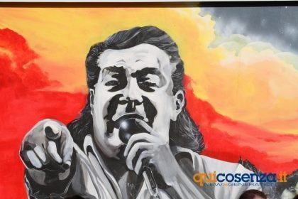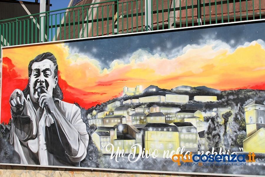 Davanti il palazzetto dello sport, un vero e proprio quadro commemorativo. Il murales realizzato da Matteo Zenardi, grazie al contributo di Hobby Color, nel quartiere di “Casali”, luogo nel quale il compianto cantante cosentino è cresciuto ed ha vissuto