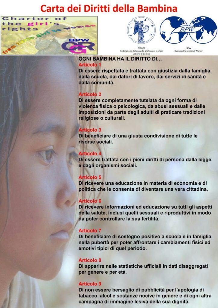 La carta dei diritti della bambina, approvata nel 1997 a Reykjiavik in occasione del IX Congresso della B.P.W Europe (Business Professional Women), ONG che opera in collaborazione con le Nazioni Unite e a cui la F.I.D.A.P.A. (Federazione Italiana Donne Arti Professioni Affari) è affiliata, è stata recentemente aggiornata, in considerazione delle leggi sopravvenute in tutto il mondo, in seno al Meeting delle Presidenti Europee della BPW in data 30 Settembre 2016. Ritenuto dunque che la Carta dei Diritti della Bambina deve essere letta come una premessa fondamentale per l’affermazione e la tutela dei diritti delle donne fin dalla nascita l’Amministrazione comunale di Trebisacce, da sempre sensibile al tema della tutela dei minori, ha scelto di favorirne la diffusione e la conoscenza presso i Servizi educativi ed integrativi della prima infanzia, nelle scuole di ogni ordine e grado, nelle pediatrie di comunità, nei Reparti di Ostetricia e Preparazione al Parto, nei Reparti di Neonatologia e Pediatria ospedaliera, tra le Associazioni di varia natura e le giovani generazioni.