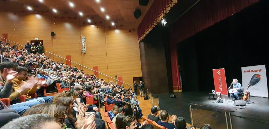 RENDE – Non solo uno spettacolo ma un incontro fatto di domande, sorrisi e dell’emozione di vedere Brunori raccontare il suo “Cip!” con una chitarra davanti ai tanti studenti dell’Unical, che gli rispondono a colpi di applausi. «E’ un disco di dialogo che parla di un ‘noi’, scritto per unire e quindi mi piace l’idea di un rapporto diretto con le persone. Si tratta di costruire una comunità che dialoga – racconta Dario Brunori – partendo dal disco, sulle tematiche del disco stesso e in generale degli argomenti più vicini a noi». Davanti a sè ci sono tanti fan, quelli che lui stesso definisce “brunoriani”. Il suo nuovo album Cip! è già in testa alle classifiche e farà tanta strada. Così come ne ha fatta lui, Brunori Sas che proprio domani mette un altro tassello importante alla sua carriera con l’uscita del nuovo film di Aldo, Giovanni e Giacomo “Odio l’estate”, tredicesima pellicola del trio comico firmandone la colonna sonora. Dario insieme alla sua band, sotto la produzione di Picicca. L’incontro di ieri all’Unical si è aperto a suon di musica, con un brano tratto dal nuovo album, ed il suo ‘amichevole’ show è proseguito a suon di riflessioni, battute, momenti ironici e anche “domande al buio” estratte da una scatola.