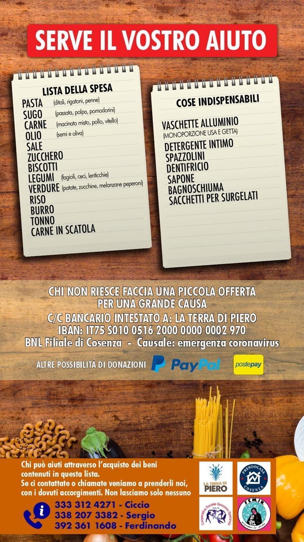 Dopo la pubblicazione da parte del comune di Rende e sui social, della lista a cui chiedere aiuto le richieste si sono moltiplicate dall’oltre Campagnano sino alla statua di Telesio. “Stiamo distribuendo circa centocinquanta pasti al giorno e alimenti in scatola –ha dichiarato Francesco Chiarello operatore della Terra di Piero – ma i numeri sono destinati a crescere”.
