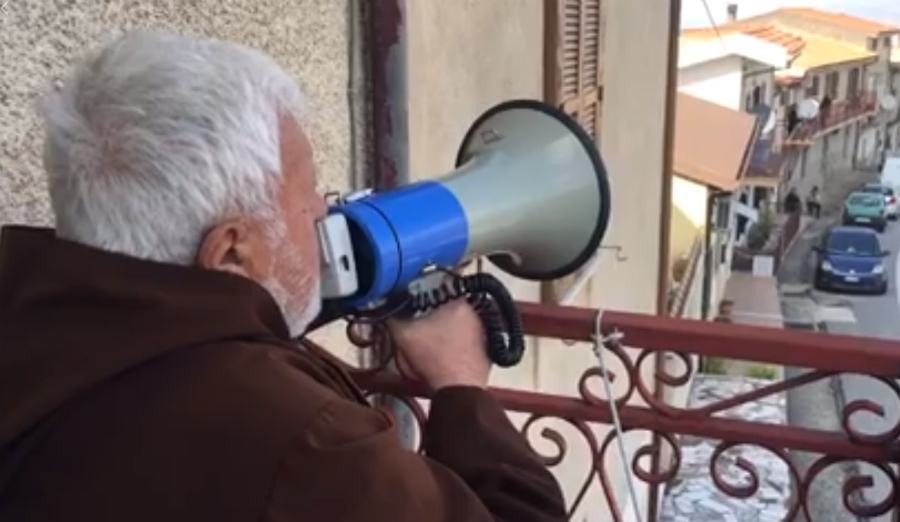 DIPIGNANO (CS) – “Il farmaco più potente che ci sia è la preghiera” e così Padre Fedele, a casa a Laurignano, in rispetto del decreto dal governo, ogni giorno recita il rosario con il megafono, alle 15. “Io non mi muovo di qui, al massimo scendo un attimo a prendere il giornale – dice il religioso – e poi passo la giornata a scrivere e a pregare”. Il Rosario recitato dal suo balcone ha un vasto seguito: in tanti si affacciano alle finestre della zona, in tutta la vallata, fin dove arriva il suono della voce di Padre Fedele, che invita alla preghiera e alla speranza.