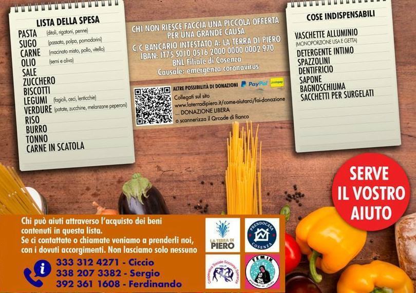 Una rete di solidarietà a Cosenza per aiutare le famiglie bisognose e non far mancare loro un pasto caldo e un pò di spesa. La Terra di Piero con il sostegno di associazioni e cittadini ha messo in piedi un servizio molto importante ma c’è bisogno dell’aiuto di tutti