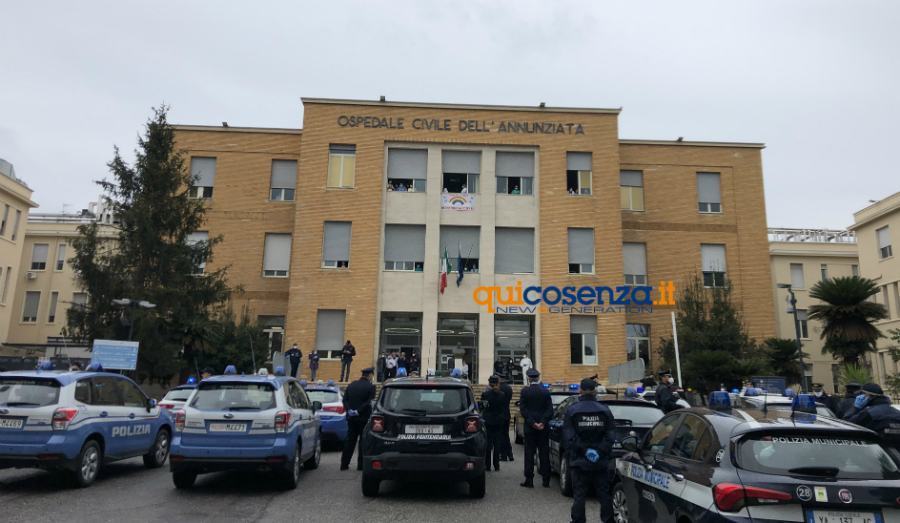 COSENZA – Le sirene squarciano il silenzio di Cosenza: una città come altre, zittite dalla pandemia. È il commovente saluto che delle forze dell’ordine locali hanno tributato al lavoro incessante del personale sanitario dell’Annunziata. Sono ordinati, come si dispiegano i militari in battaglione, dinnanzi l’ingresso principale del nosocomio bruzio. “Attenti, saluto”, ordina il più alto in grado e il suone delle sirene irrompe nell’aria.