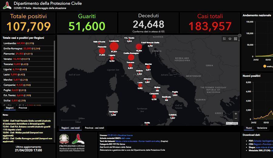 Il dato negativo, purtroppo, riguarda sempre il numero dei morti saliti 24.648 con un aumento rispetto a ieri di 534, quasi cento in più rispetto al dato di ieri ieri. Numeri alti in Lombardia, Emilia Romagna, Piemonte e Veneto dove da ieri si contano 389 decessi. I tamponi complessivi sono 1.450.150, 52.126 più di ieri. Oltre 680mila sono stati effettuati in Lombardia, Emilia-Romagna e Veneto. Al 19 aprile risultano distribuiti alle Regioni circa 3.900 ventilatori per le terapie intensive, 105 mila tubi endotracheali, 117 milioni di mascherine di varie tipologie. Per quanto concerne la distribuzione di dispositivi sanitari e di protezione personale, tramite il sistema Analisi Distribuzione Aiuti (ADA), aggiornato in tempo reale, sono disponibili sui siti Internet della Presidenza del Consiglio, del Ministero della Salute e della Protezione civile tutte le informazioni su dispositivi, apparecchiature e distribuzione che ogni giorno il Commissario Arcuri invia alle Regioni e alla Province autonome per fronteggiare l’emergenza.