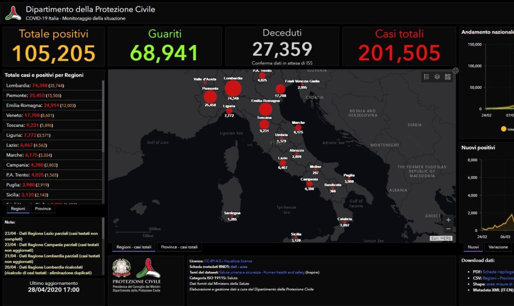Sono 201.505 i casi totali di coronavirus in Italia, terza nazione al mondo per numero di contagi. Continua a diminuire il numero degli attualmente positivi e dei ricoveri. Dato in controtendenza resta purtroppo quello delle vittime con 385 nuovi decessi