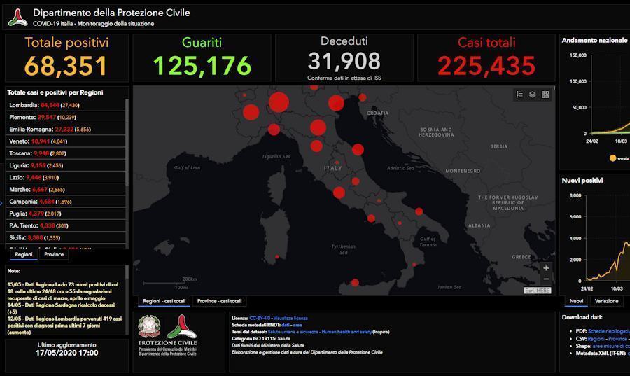 COSENZA – Nell’ambito del monitoraggio sanitario relativo alla diffusione del coronavirus in Italia a oggi, 17 maggio, il totale delle persone che hanno contratto il virus è salito a 225.435, con un incremento rispetto a ieri di 675 nuovi casi. La maggior parte sono nuovamente concentrati in Lombardia con 326 nuovi positivi (circa il 48% del totale), 64 casi si sono registrati in Piemonte, 50 in Emilia Romagna, 50 nel Lazio, 48 in Liguria e 35 in Toscana. Continua il calo costante delle persone attualmente positive e dei ricoveri al minimo storico. Il numero totale delle persone ancora malate è di 68.351, con una decrescita rispetto a ieri di 1.836 persone.