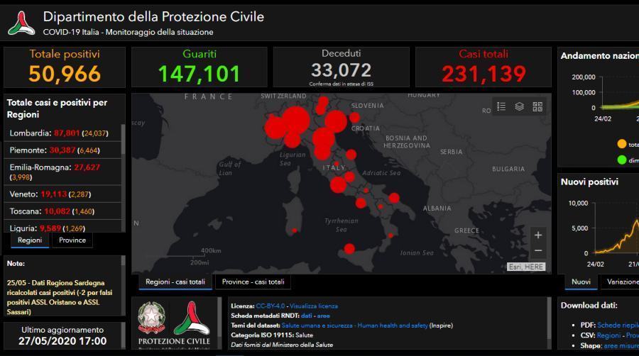 Quanto alle vittime, Lombardia 15.954 (+58), Piemonte 3.828 (+16), Emilia-Romagna 4.083 (+7), Veneto 1.895 (+9), Toscana 1.027 (+6), Liguria 1,438 (+7), Lazio 701 (+8), Marche 996 (+0), Campania 406 (+1), Provincia autonoma di Trento 462 (+1), Puglia 495 (+1), Sicilia 272 (+1), Friuli Venezia Giulia 331 (+2), Abruzzo 400 (+0), Provincia autonoma di Bolzano 291 (+0), Umbria 75 (+0), Sardegna 130 (+0), Valle d’Aosta 143 (+0), Calabria 96 (+0), Basilicata 27 (+0), Molise 22 (+0).