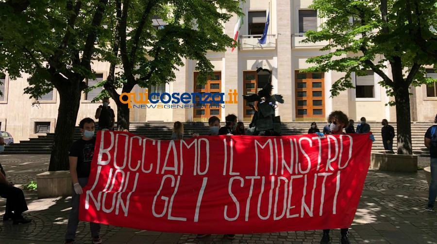 “Bocciamo il ministro non gli studenti” è lo striscione esposto dagli studenti cosentini questa mattina in piazza XI Settembre