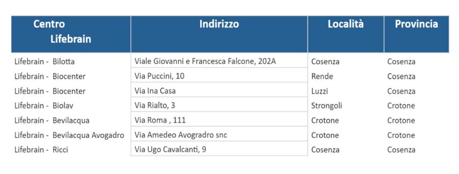I centri Lifebrain in Calabria nei quali è possibile effettuare il test sierologico sono: