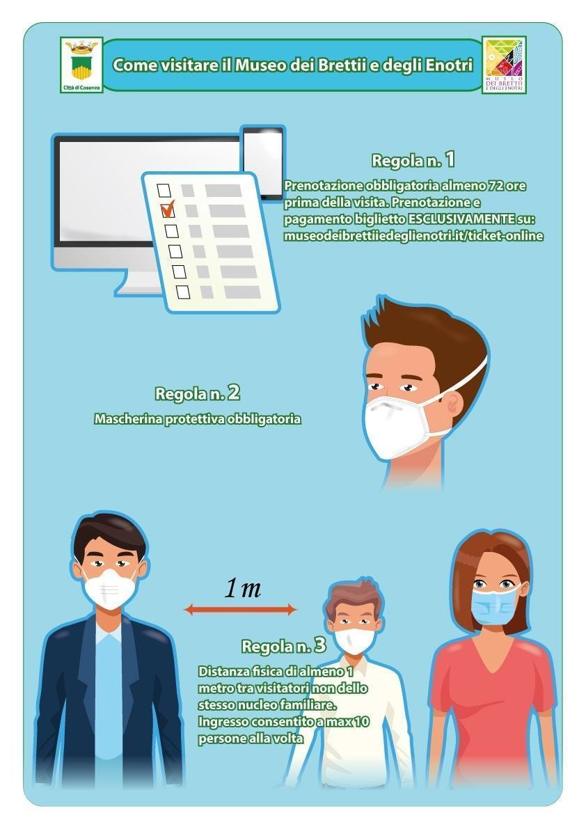 il Museo sarà visitabile su prenotazione, obbligatoria, da inviarsi almeno 72 ore prima della visita esclusivamente al link museodeibrettiiedeglienotri.it/ticket-online, attraverso il quale dovrà essere effettuato, con carta di credito, anche il pagamento del biglietto, le cui tariffe rimangono invariate; l’accesso al Museo è consentito ad un massimo di 10 persone alla volta, secondo turni per fasce orarie prenotabili al suddetto link; la prenotazione dovrà essere effettuata per i seguenti giorni e orari: da martedi a venerdi dalle 9.00 alle 13.00 e dalle 16.30 alle 19.30; il sabato e la domenica e i festivi dalle 10.00 alle 13.00 e dalle 16.30 alle 19.30. Resta invariato il giorno di chiusura del Museo che coincide con il lunedì; i visitatori dovranno essere obbligatoriamente forniti di mascherina e rispettare le altre misure anti-contagio: distanza fisica di almeno 1 metro e utilizzo dei dispositivi igienizzanti messi a disposizione dal Museo. Tutti gli eventuali aggiornamenti saranno costantemente pubblicati sul sito e sui canali social del Museo. Per ulteriori informazioni si potrà chiamare il numero 0984.23303 o scrivere alla mail museo@comune.cosenza.it.