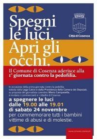 che troppo spesso avvolge i casi di abusi sui minori. Lo hanno capito bene Don Fortunato Di Noto, da sempre in prima linea contro la pedofilia, con la sua Associazione “Meter”, e il giornalista Mario Campanella, presidente dell’Associazione “Peter Pan” che hanno proposto una giornata contro il preoccupante fenomeno criminoso che ha avuto il sostegno dalla Lega Calcio e dalla Presidenza della Camera dei Deputati. Mentre su tutti i campi di calcio di serie A, dall’anticipo di domani Palermo-Catania, alle partite di domenica e ai posticipi di lunedì (Cagliari-Napoli e Parma-Inter) e di martedì (Lazio-Udinese) sarà esposto uno striscione anti-pedofilia, con la scritta “La pedofilia è un crimine. Difendiamo i nostri bambini. Sosteniamo Meter onlus”, così come sarà letto dagli speaker degli stadi un messaggio per sensibilizzare l’opinione pubblica sulla gravità di questo problema, a Cosenza l’amministrazione comunale guidata dal sindaco Mario Occhiuto, accogliendo la proposta di Mario Campanella, ha rivolto, per sostenere l’iniziativa, un appello a tutti i cittadini e ai commercianti a spegnere le luci di casa e dei negozi domani, per un solo minuto: dalle 19,00 alle 19,01. Questa mattina l’iniziativa, denominata “Spegni le luci. Apri gli occhi” è stata illustrata a Palazzo dei Bruzi nel corso di una conferenza stampa che ha visto la partecipazione del giornalista Mario Campanella, Presidente dell’Associazione “Peter Pan” e dell’assessore alla solidarietà e coesione sociale Alessandra De Rosa. Assente per sopravvenuti impegni istituzionali, l’assessore alla comunicazione Rosaria Succurro che ha attivamente partecipato a tutta la fase preparatoria dell’iniziativa.