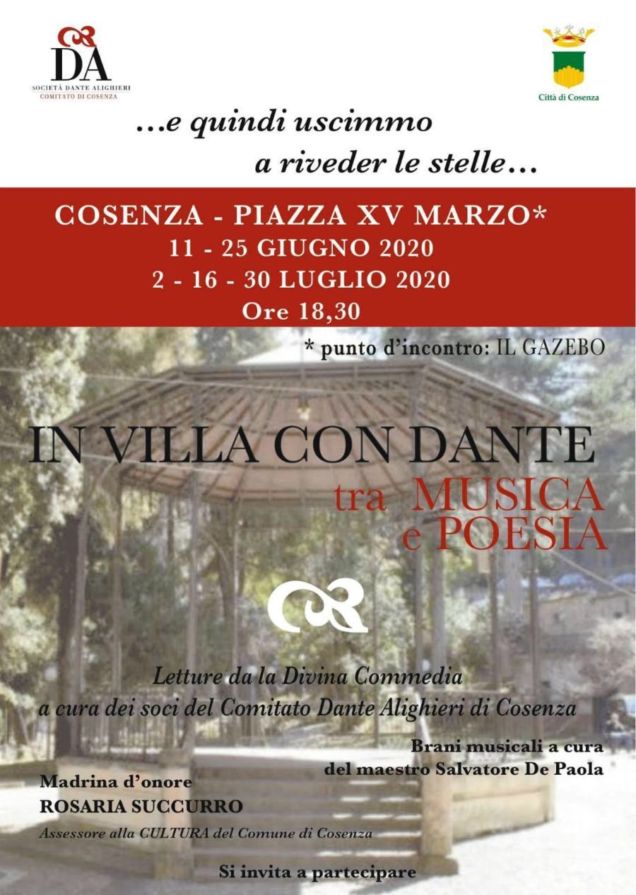 COSENZA – Riparte dalla Vecchia Villa comunale l’attività del Comitato di Cosenza della Società “Dante Alighieri”, presieduto dalla professoressa Maria Cristina Parise Martirano, dopo i lunghi mesi di fermo forzato, a causa dell’emergenza Covid-19. Da domani sarà proprio il Gazebo del polmone verde del centro storico cittadino a fare da luogo ideale della ripartenza dopo il lockdown, con il progetto, promosso in collaborazione con l’Amministrazione comunale “…e quindi uscimmo a riveder le stelle…” . Si tratta di una serie di incontri culturali raggruppati nel titolo “In Villa con Dante tra musica e poesia” per offrire alla città, senza il rischio di assembramenti, cinque incontri, tra giugno e luglio, a cadenza quindicinale, intorno all’antico Gazebo, consistenti in un ciclo di letture tratte da “La Divina Commedia” e affidate agli stessi soci del Comitato di Cosenza della “Dante Alighieri”. I brani musicali saranno a cura del maestro Salvatore De Paola.