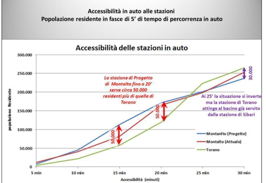 In conclusione si può dire che l’analisi dell’indicatore di accessibilità mostra come la stazione di progetto di Montalto risulti più appropriata di quella di Torano in termini di residenti serviti nel più breve tempo possibile. Se si considera che questo dato non tiene conto dell’ulteriore contributo che darà la viabilità di progetto (che prevede anche la realizzazione del nuovo svincolo di Rende), e non tiene conto della presenza dell’Università nelle immediate vicinanze (l’indicatore si riferisce alla sola popolazione residente sul territorio) risulta inconfutabile la preferenza per la stazione di progetto di Montalto.