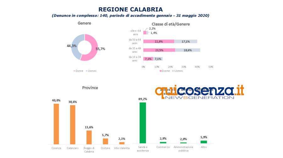 In tutta italia le denunce di infortunio sul lavoro da Coronavirus pervenute all’Inail sono in totale 47.022. In Calabria sono 140 con 1 decesso e in testa c’è la provincia di Cosenza con 56 denunce. Circa l’89,2% delle denunce ha riguardato il settore della sanità e dell’assistenza sociale
