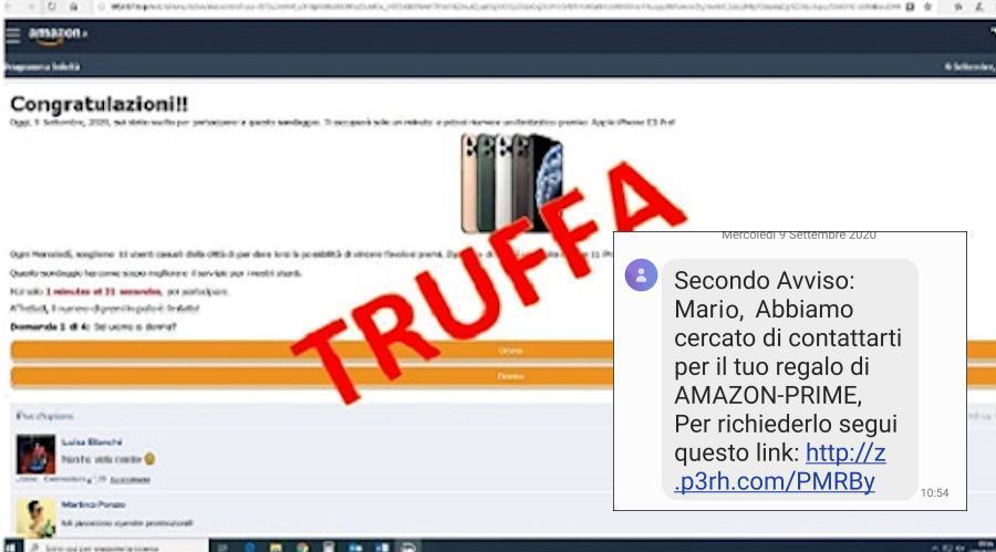 COSENZA – Negli ultimi giorni numerosi utenti stanno segnalano la ricezione di un SMS sul proprio telefono con il seguente testo: “Secondo Avviso: (Nome utente), abbiamo cercato di contattarti per il tuo regalo di AMAZON-PRIME, Per richiederlo segui questo link: http:/….. (Nome Link) &quot2“. Cliccando sul link inserito nel messaggio, l’ignaro utente viene indirizzato su una finta pagina di Amazon, dove gli viene richiesto di rispondere a delle semplici domande personali, al termine delle quali è richiesto il pagamento, tramite carta di credito, di una somma irrisoria per ottenere un costoso iPhone. Ovviamente, avverte la polizia postale, si tratta di una truffa che sottrae l’importo agli utenti, ma il cellulare non verrà mai spedito.
