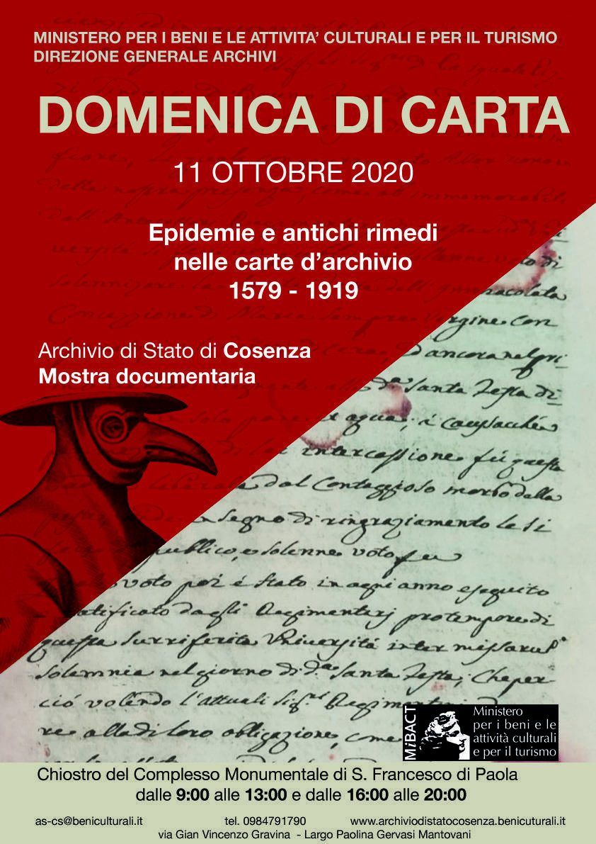 COSENZA – Domani, domenica 11 ottobre, dalle 9 alle 13 e dalle 16 alle 20, per la Domenica di carta 2020 l’Archivio di Stato di Cosenza propone la mostra documentaria “Epidemie e antichi rimedi nelle carte d’archivio” a testimonianza delle varie malattie infettive che tanto hanno influito sulle vicende della popolazione come peste, lebbra, vaiolo, colera, tifo, influenza e tubercolosi.