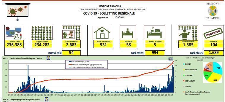 CATANZARO – Non si arresta il numero dei contagi in Calabria, dopo il record di ieri, anche oggi il bilancio dei casi positivi nella nostra Regione sale a 2.683 (+94 rispetto a ieri). I casi confermati oggi sono così suddivisi: 35 a Cosenza, 9 a Catanzaro, 2 a Crotone, 0 a Vibo Valentia, 34 a Reggio Calabria. Altra Regione o stato Estero 14. In Calabria ad oggi sono stati sottoposti a test 234. 282 soggetti per un totale di 236388 tamponi eseguiti (allo stesso soggetto possono essere effettuati più test); quelli risultati negativi sono 231.599. I tamponi processati tra ieri ed oggi sono invece 2.995.