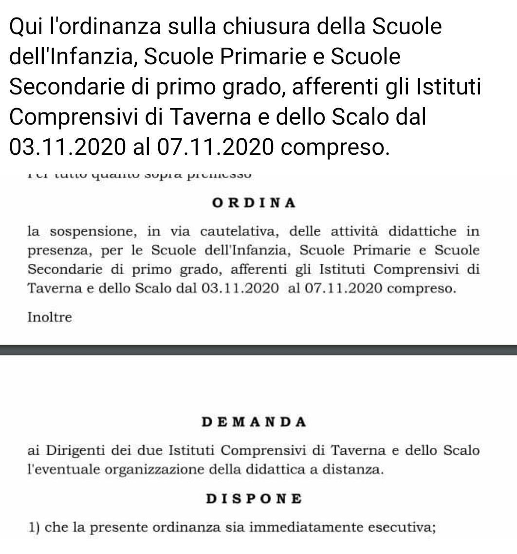 MONTALTO UFFUGO (CS) – Il sindaco di Montalto Uffugo, Pietro Caracciolo, questa mattina ha firmato l’ordinanza di chiusura di tutte le scuole dei plessi degli Istituti Comprensivi di Taverna e Montalto Scalo. L’ordinanza si è resa necessaria a causa dei due casi di positività che interessano i due Istituti. La decisione di chiudere tutti i plessi è arrivata a seguito di un incontro tra il sindaco e le due dirigenti degli Istituti, Concetta Nicoletti e Gemma Faraco; a cui hanno partecipato, anche, il consigliere delegato alla Protezione civile Silvio Ranieri e l’Assessore all’istruzione Emilio D’Acri. La sospensione in via cautelativa, delle attività didattiche in presenza, per le Scuole dell’Infanzia, Scuole Primarie e Scuole Secondarie di primo grado, afferenti gli Istituti Comprensivi di Taverna e dello Scalo è valida dal 03.11.2020 al 07.11.2020 compreso. L’Asp, intanto, ha avviato l’indagine epidemiologica volta a rintracciare tutti i contatti, con la collaborazione dei due Istituti.
