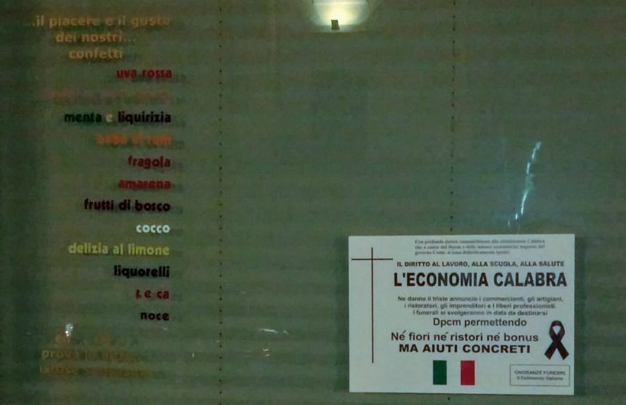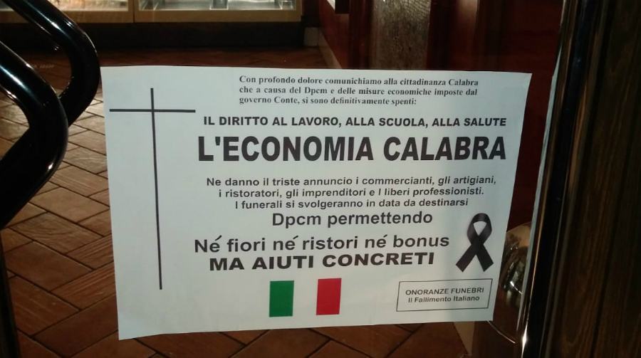 “Con profondo dolore, comunichiamo alla cittadinanza Calabra che a causa del DPCM e delle misure economiche imposte dal governo Conte, si sono definitivamente spenti: Il diritto al lavoro, alla scuola, alla salute nonché – continua il necrologio – la morte dell’economia della Calabria. Ne danno il triste annuncio, i commercianti gli artigiani, i ristoratori, gli imprenditori ed i liberi professionisti. I funerali – conclude il necrologio – in data da destinarsi DPCM permettendo. Né fiori, né ristori, né bonus, ma aiuti concreti”.