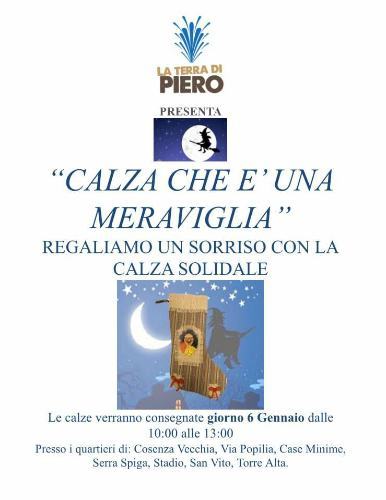 COSENZA – Dopo il successo delle scatole scalda cuore arriva l’iniziativa “Calza che è una meraviglia” promossa dalla Terra di Piero. “La Befana dal cuore nobile. Regaliamo un sorriso con la calza solidale”. Creiamo anche noi la nostra calza solidale, per donare sorrisi e gioia ai tanti bambini meno fortunati.