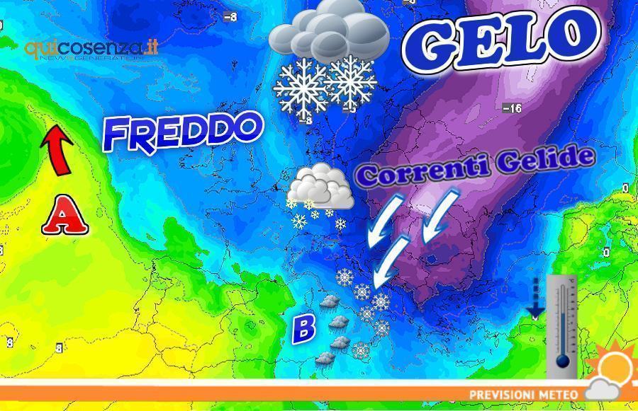 COSENZA – Crollo delle temperature, venti gelidi da est, piogge e anche nevicate anche a quote relativamente basse. Un nucleo di aria gelida di matrice artico continentale, sta muovendo dalla Russia verso l’Est Europa, dove sono attese temperature diffusamente e abbondantemente sottozero anche di giorno, per poi interessare i Balcani, la Grecia e la Turchia. E come spesso capita con questo tipo di irruzioni fredde (sarebbe la prima vera ondata al Sud di questa stagione invernale vissuta tra alti e bassi) in parte interesserà anche le regioni adriatiche e il Sud peninsulare, dove si potrebbero creare tutti i presupposti per delle nevicate a bassissima quota anche sulla Calabria.