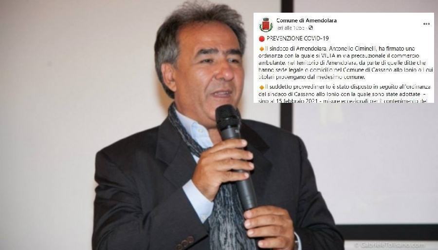 COSENZA – Il sindaco di Amendolara, Antonello Ciminelli, con un provvedimento emanato lo scorso 4 febbraio, vieta “in via precauzionale il commercio ambulante nel territorio comunale di Amendolara fino al 15 febbraio 2021 da parte di ditte che hanno sede legale o domicilio nel Comune di Cassano allo Ionio o i cui titolari provengano dal medesimo comune”. L’ordinanza viene emanata perché Cassano si trova in “zona rossa” fino al 15 febbraio.