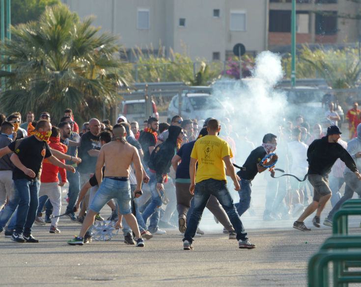 MESSINA – La gara di Lega Pro tra Messina e Reggina, finita 1-0 per la squadra ospite ha condannato alla retrocessione i giallorossi. E a seguito del match, si sono verificati scontri e tafferugli tra tifosi e polizia. Tre gli agenti rimasti lievemente feriti. Gli inquirenti dopo aver visionato i filmati della partita hanno identificato e poi arrestare alcuni degli autori degli scontri con le forze dell’ordine. Il più grande ha 44 anni, il più piccolo 21 ed è stato anche denunciato un sedicenne. Gli arrestati sono supporter del Messina: Gabriele Sottosanti, 27 anni; Massimiliano Turrisi, 22 anni; Domenico Messina, 28 anni; Davide Siracusa, 30 anni; Ivano Guglielmino, 34 anni; Gaetano Arcidiacono, 44; Matteo Astuto, 27 anni; Domenico Ruggeri, 21; Filippo Bonaccorso, 37. Denunciato S.O., 16 anni. Tutti sono accusati di aggressione e lesioni. Secondo quanto riferito dalla polizia, un gruppo di tifosi della curva sud ha cercato di invadere il campo e lanciato lanciato oggetti fumogeni e bottiglie d’acqua. Uno degli arrestati è riuscito ad entrare nel rettangolo di gioco e con una cintura ha colpito uno steward. Poco dopo i tifosi giallorossi hanno preso di mira i 700 supporter della Reggina che si stavano lasciando il loro settore. Fronteggiati da agenti del Reparto mobile, i tifosi hanno lanciato pietre, fumogeni e petardi all’indirizzo delle forze dell’ordine che li fronteggiavano. Tre agenti sono rimasti lievemente feriti: uno colpito al volto, gli altri due per l’esplosione di una bomba carta.