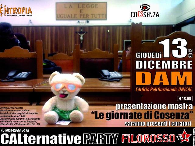 della mostra sarà al Dam, all’Unical. La storia parla di una meravigliosa pagina di storia, scritta il 23 novembre 2002 a Cosenza, quando decine di migliaia di persone scesero in piazza per chiedere la liberazione delle attiviste e degli attivisti noglobal arrestati nell’inchiesta sul sud ribelle. A dieci anni di distanza la Coessenza ha ricordato quei giorni di mobilitazione, e le tappe successive della vicenda, con una mostra di materiali fotografici firmati da autori diversi che hanno volontariamente contribuito al progetto grafico curato da Dino Grazioso. In trenta pannelli 70×100 viene raccontata la grande lezione di civiltà di una piccola città del Sud Italia capace di ribellarsi alle ingiustizie e di ribaltare con dignità e determinazione il corso degli eventi. Il 15 novembre 2002 Cosenza si risvegliò al centro di una maxioperazione di polizia che portò in carcere 20 persone per reati di cospirazione politica, legati alle vicende del G8 di Genova. La città reagì subito agli arresti, venne convocata una conferenza stampa, in cui presero posizione il sindaco e il consiglio comunale, assemblee e cortei si susseguirono – a Cosenza come a Napoli, a Roma e in altre città – fino al grande appuntamento del 23 novembre, preceduto da un’assemblea oceanica nell’Aula Magna dell’Unical. Nel giro di 18 giorni tutti gli arrestati vengono liberati. Il 2 dicembre 2004 iniziò il processo di primo grado che si è concluso solo a giugno di quest’anno in cassazione con la piena assoluzione di tutti gli imputati. La mostra rappresenta un contributo alla memoria collettiva, grazie ai lavori di Gianni Muraca, Manuela Perna, Luca Mannarino, Francesco Grazioli, Guru, Luigi Celebre, Stefania Tropea, FataNera, Ciccio Noto e tanti altri. Allestita ieri all’Università della Calabria presso il DAM, resterà aperta fino al 18 dicembre (secondo gli orari d’apertura della struttura, dalle 9 alle 19, escluso sabato e domenica) per poi spostarsi in città nell’area delle ex Officine su viale Parco, dove rimarrà disponibile al Rialzo per tutte le vacanze natalizie. Nell’ambito dell’esposizione al DAM, l’Associazione culturale Entropia ha previsto per giovedì 13 dicembre alle ore 18 la presentazione pubblica della mostra con i curatori della Coessenza.
