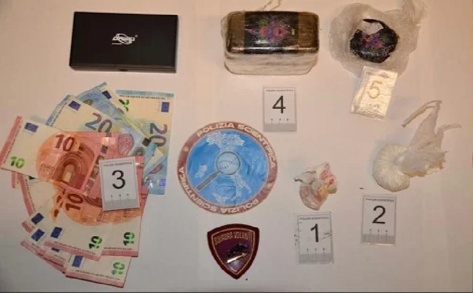 Intorno alla finestra dove il giovane si era sporto è stato trovato un involucro in cellophane contenente 5 panetti di sostanza stupefacente di tipo hashish. A seguito della perquisizione domiciliare, inoltre, avvolti in un sacchetto trasparente, sono stati trovati altri due involucri in cellophane contenenti cocaina e pezzi di hashish, un bilancino ancora intriso di polvere bianca e la somma di euro 210, probabile provento dell’attività di spaccio.