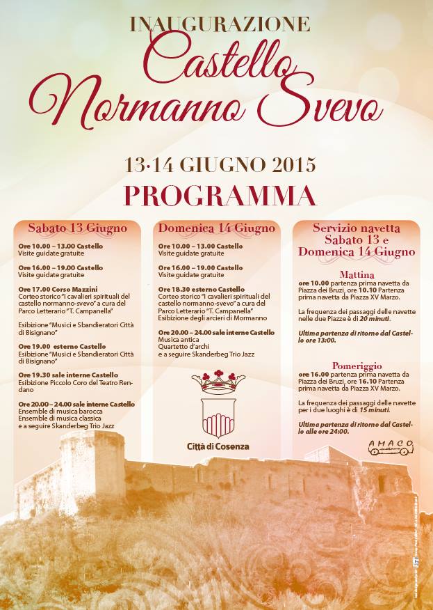 Pomeriggio, ore 16:00 partenza prima navetta da Piazza dei Bruzi, ore 16:10 Partenza prima navetta da Piazza XV Marzo. La frequenza dei passaggi delle navette per i due luoghi è di 15 minuti. Ultima partenza di ritorno dal Castello alle ore 24:00.