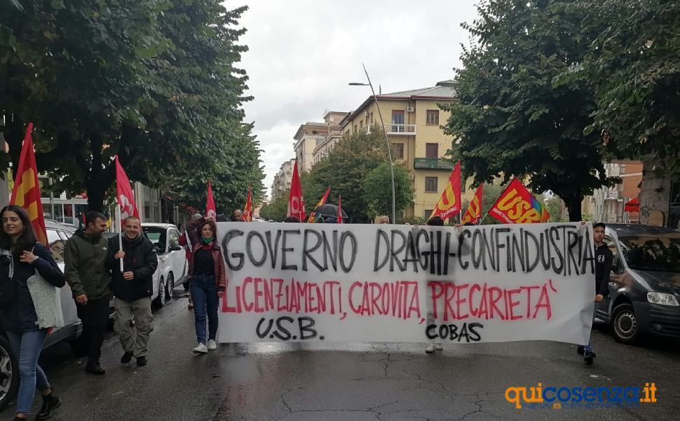 COSENZA – Dal blocco dei licenziamenti alla riduzione dell’orario di lavoro a parità di retribuzione, ma anche una rivalutazione delle pensioni. Sono alcuni dei punti rivendicati con lo sciopero di oggi. A Cosenza, il corteo promosso da USB Cosenza Confederazione Provinciale, Cobas Lavoro Privato Cosenza e Fronte della Gioventù Comunista, è partito da piazza Loreto per arrivare in piazza 11 Settembre, con una tappa davanti la sede di Confindustria: “il Governo ha deciso ancora una volta di piegarsi a Confindustria e ha rimosso il blocco dei licenziamenti, misura rivelatasi insufficiente in quanto sono stati comunque licenziati un milione di lavoratori”.