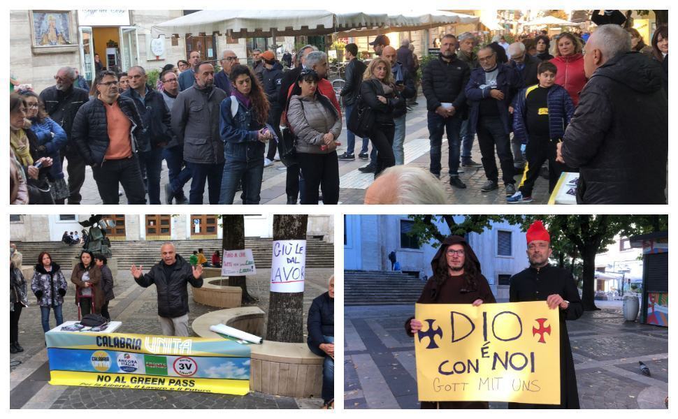 COSENZA – Sono una cinquantina le persone che si sono ritrovate in piazza 11 Settembre a Cosenza per protestare contro l’entrata in vigore del green pass sui luoghi di lavoro. Tra i manifestanti gente travestita da vescovo e da monaco, con cartelli che riportano frasi utilizzate in passato sulle fibbie delle divise naziste. I manifestanti dichiarano di disconoscere la provenienza del motto è dicono: “Siamo qui perché crediamo che chi vuol lavorare debba essere libero di poterlo fare”. La manifestazione è stata organizzata attraverso l’utilizzo dei canali social.