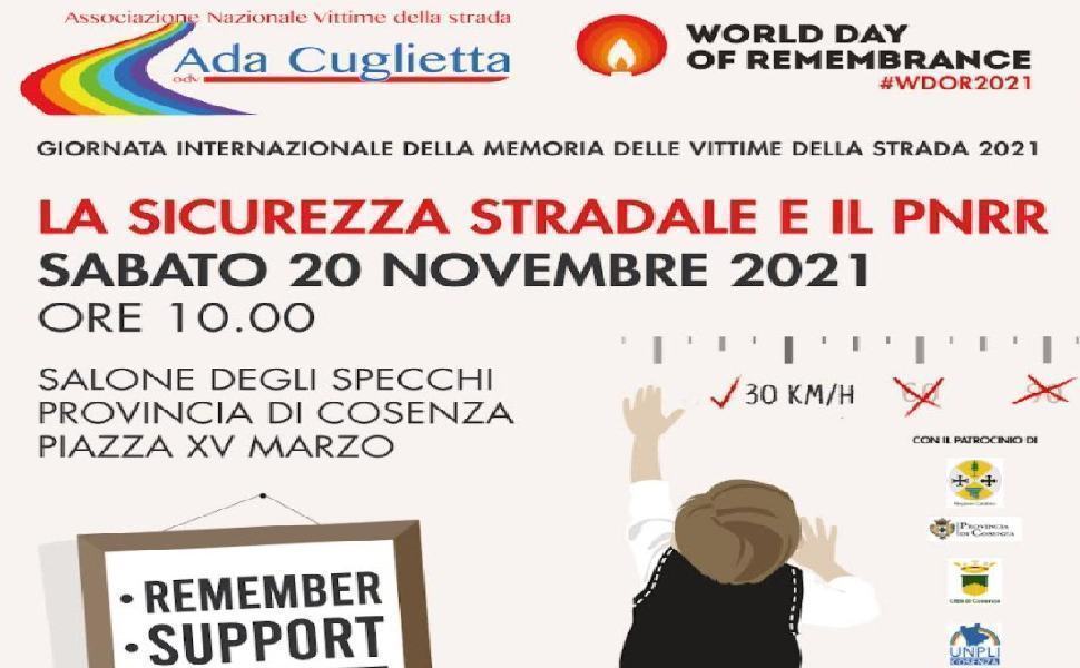 COSENZA – In occasione della Giornata Mondiale della Memoria delle vittime della strada, domani sabato 20 novembre 2021 alle ore 10.00 al Salone degli Specchi della Provincia di Cosenza si terrà il convegno pubblico dal titolo “la sicurezza stradale ed il pnrr” organizzato dall’associazione “ADA CUGLIETTA” odv.