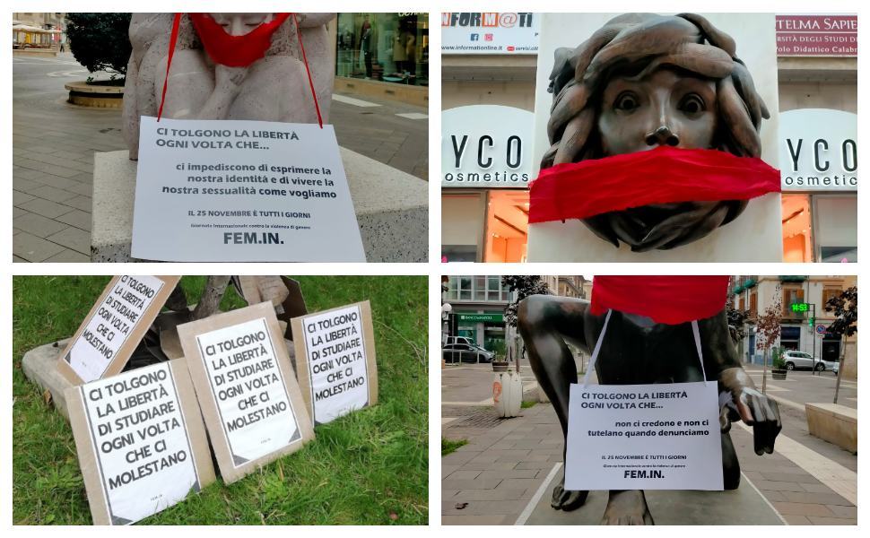 COSENZA – In occasione della giornata contro l’eliminazione della violenza sulle donne anche le Fem.In cosentine scendono in piazza per protestare pacificamente con cartelli appesi sulle principali opere del MAB di Corso Mazzini di Cosenza allo slogan di “Ci tolgono la libertà ogni giorno“.