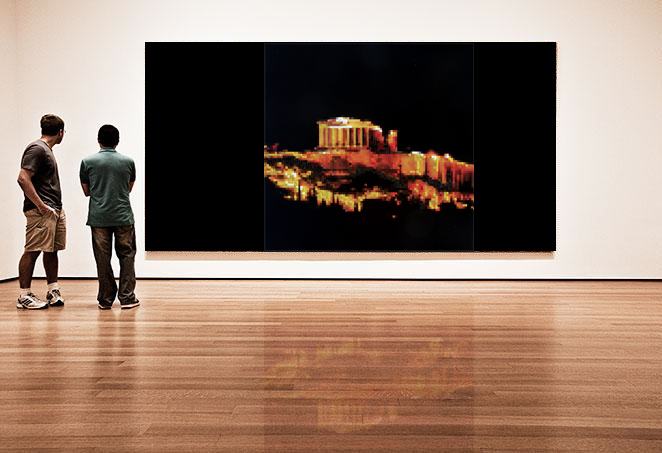 L’opera di Elda Longo si manifesta essenzialmente con la presentazione allo spettatore di scatti fotografici dedicati a luoghi noti: visioni note di luoghi illustri, spesso ritratti notturni, luoghi familiari, internazionali, fotografati personalmente dall’artista in oltre quindici anni di ricerca. Scatti fotografici ingranditi quindi, riproposti su tela e reinterpretati con una tecnica mista personalissima nata dall’unione di strumenti antichi e metodi informatici all’avanguardia: grandi pixel colorati calcolati da un processore matematico che dialogano e convivono con classiche tessere di mosaico vitreo che sottolineano e portano fuori dallo schermo e dagli schemi della tela dettagli dell’iniziale scatto fotografico dell’artista. Lo spettatore percepisce quindi a breve distanza una visione tridimensionale e frammentata del soggetto ritratto, visione che riguadagna la propria uniformità con una lettura a distanza dell’opera, in un dialogo continuo tra definizione e particolare.