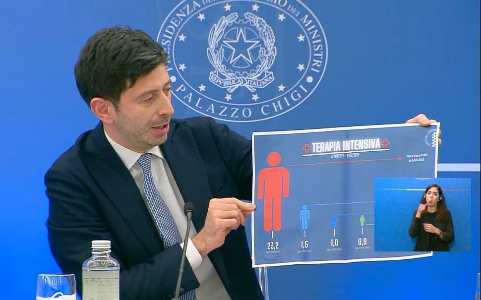 “Su 100mila abitanti, sui non vaccinati, – spiega Speranza – ci sono 23,2 persone che finiscono in terapia intensiva. Quando si passa alle persone vaccinate con due dosi da più di 4 mesi questo dato crolla a 1,5 persone ogni 100mila abitanti. Numeri che scendono ulteriormente a una persona ogni 100mila quando il ciclo primario della vaccinazione avviene entro 4 mesi. Addirittura si scende a 0,9 persone con il booster. Questo grafico spiega più di mille parole il decreto che abbiamo approvato. Se vogliamo salvare vite umane e ridurre la pressione ospedaliera, se vogliamo far ripartire il Paese anche dal punto di vista economico, la strada prioritaria è quella di ridurre il numero dei non vaccinati. È una strada che ha piena e compiuta evidenza scientifica” ha concluso il Ministro della Salute.