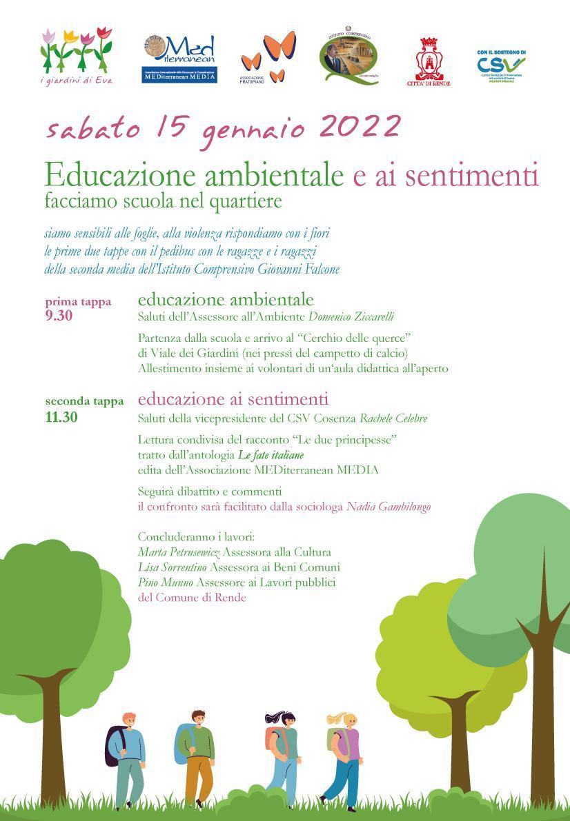 RENDE – L’iniziativa intitolata “Educazione ambientale e ai sentimenti, facciamo scuola nel quartiere”, si terrà domani, sabato 15 gennaio a partire dalle 10, in viale dei Giardini, a Rende, ed è promossa dall’associazione ‘I Giardini di Eva’. Alla giornata, realizzata con il sostegno del CSV Cosenza, parteciperanno le ragazze e i ragazzi dell’Istituto comprensivo Giovanni Falcone di Rende, le insegnanti che hanno guidato i laboratori di didattica ambientale e di educazione sentimentale coordinati da Nadia Gambilongo, fondatrice dei Giardini di Eva, rappresentanti istituzionali del Comune di Rende tra cui Lisa Sorrentino, Marta Petrusewicz, Pino Munno e Domenico Ziccarrelli ed esponenti delle associazioni di volontariato.