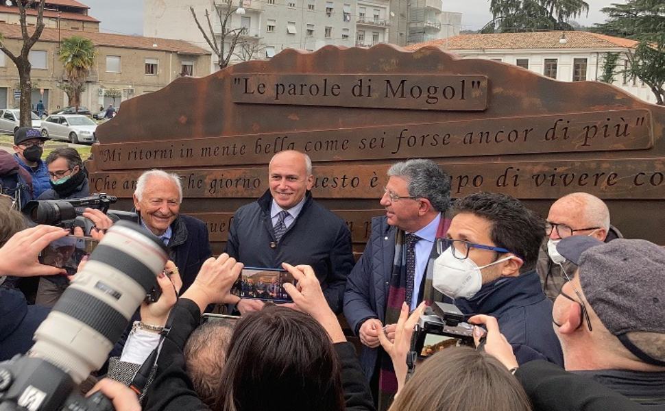 COSENZA – La scultura dedicata a Lucio Battisti ed inaugurata dal poeta delle canzoni, Giulio Rapetti Mogol, segna una prima tappa importante del processo di riqualificazione di tutta l’area di Piazza Amendola, sempre più proiettata a diventare luogo della musica. L’idea è di farla uscire dal degrado nella quale era precipitata per lungo tempo. Ieri il velo che copriva l’opera è stato tolto alla presenza del sindaco Franz Caruso, di Mogol, dell’assessore ai Lavori Pubblici Damiano Covelli che ha avuto un ruolo significativo nell’organizzazione dell’evento, e di tutta la Giunta municipale di Palazzo dei Bruzi.