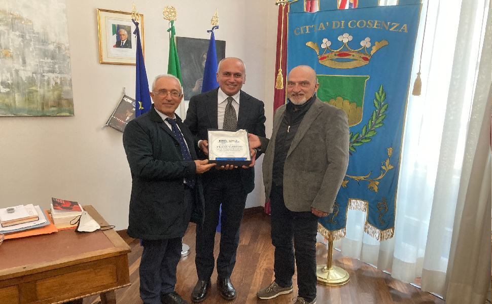 La targa al primo cittadino di Cosenza è stata consegnata dai vertici nazionali, regionali e locali per l’impegno profuso dall’Amministrazione