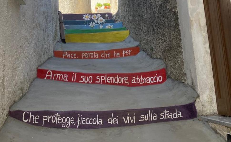 La scala della Pace, così è stata ribattezzata, si trova nel cuore di Laino Borgo. All’interno di un vicoletto, dove è presente una piccola scalinata, l’artista Sara Palermo ha raffigurato sui gradini un paesaggio floreale e i versi di Lorenzo Pataro “Pace, parola che ha per arma il suo splendore, abbraccio che protegge, fiaccola dei vivi sulla strada”. Ad arricchire la piccola cerimonia di inaugurazione dello spazio anche l’interpretazione musicale di Benny Sola.