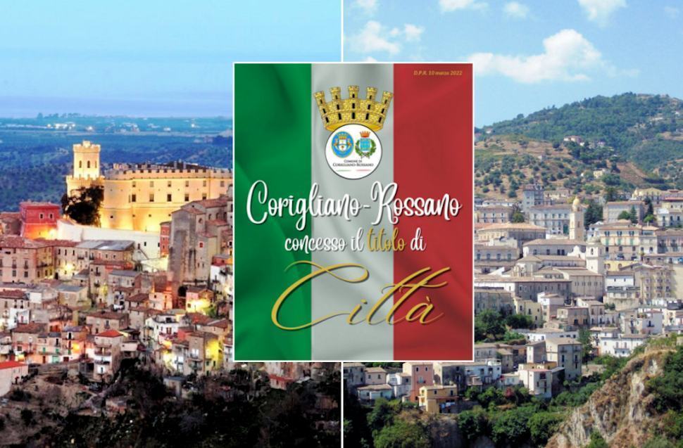 CORIGLIANO ROSSANO (CS) – Corigliano-Rossano diventa Città. Il titolo onorifico, rilasciato quando viene riconosciuta l’importanza storica, artistica, civica o demografica di un Comune, è stato decretato dal Presidente della Repubblica Sergio Mattarella accogliendo la proposta del Ministro dell’Interno. Un provvedimento che rende onore e inorgogliscono la comunità e l’Amministrazione, giunto a coronamento di un iter avviato con delibera del consiglio comunale n. 42 in data 27 luglio 2021 e passato il 10 marzo scorso attraverso il via libera del Prefetto di Cosenza.