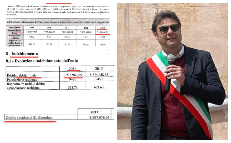 “Allora, andiamo con ordine: Il giorno del mio insediamento, nel giugno del 2014, il debito dell’ente era di 7 milioni di euro (dato di bilancio consuntivo al 31/12/2013). A fine del mio primo mandato nel 2019 il debito era sceso già a 5,5 milioni di eruo (dato al 31/12/2018 riscontrabile sul