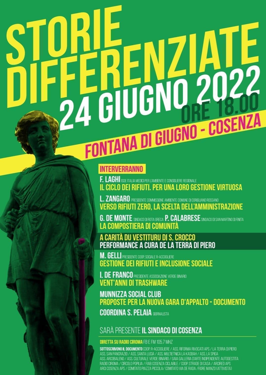 Si intitola “Storie differenziate” l’iniziativa in programma venerdì 24 giugno alle 18, a Cosenza su corso Mazzini nei pressi della fontana di Giuno