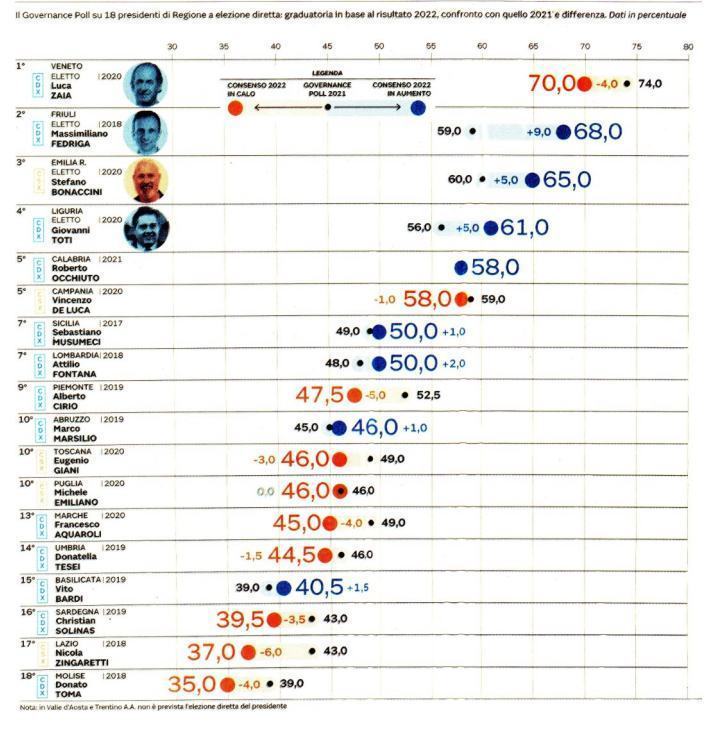 La settima posizione condivisa tra il Presidente della Lombardia Attilio Fontana e quello della Sicilia Nino Musumeci. Entrambi conquistano un 50% del consenso ed è da notare che in queste due regioni si voterà nei prossimi mesi, in Sicilia in autunno ed in Lombardia ad inizio 2023. Inoltre rispetto al giorno delle elezioni Bonaccini è il presidente che ha aumentato il maggior consenso (+13,6%) seguito da Fedriga (+10,9%) e Musumeci (+10,2%).