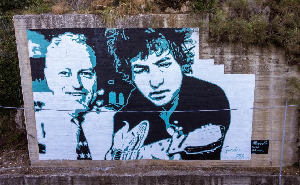 DOMANICO (CS) – La nuova tappa di Gulìa Urbana, il progetto itinerante di street art curato dall’associazione Rublanum si è conclusa con l‘artista Attorrep che ha realizzato un’imponente opera raffigurante Mike Porco e Bob Dylan. Mike Porco, partì proprio da Domanico, dove era cresciuto, verso gli Stati Uniti nella prima metà del ‘900 e proprio a New York fondò uno dei locali musicali più importanti al mondo il Gerde’s Folk City. Qui scoprì e aiutò le carriere di innumerevoli musicisti tra cui Jimi Hendrix, Janis Joplin, Simon & Garfunkel ma soprattutto divenne il deus ex machina della carriera di Bob Dylan, non a caso lo stesso, in diverse occasioni, definì Mike come suo padre, avendolo accolto tra le sue braccia quando era poco più che un adolescente.